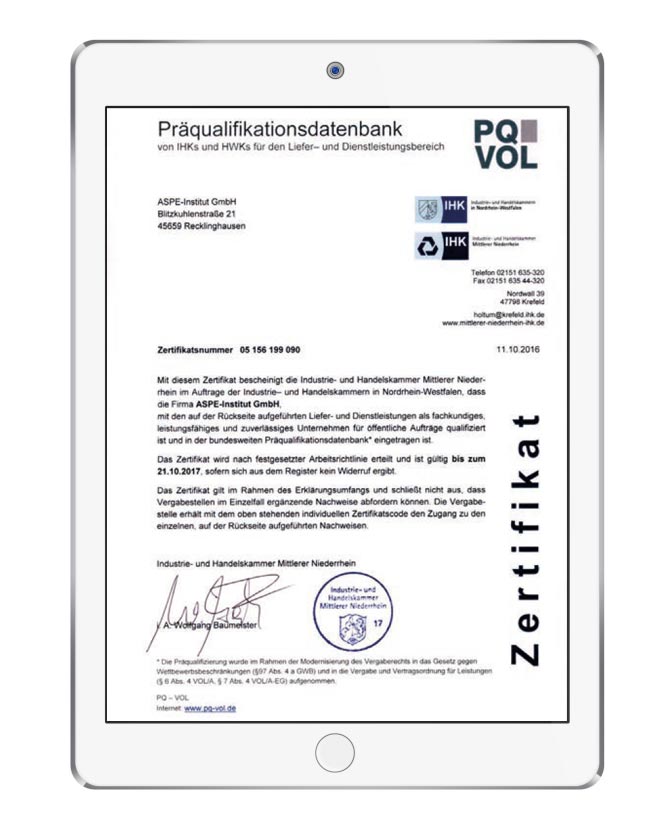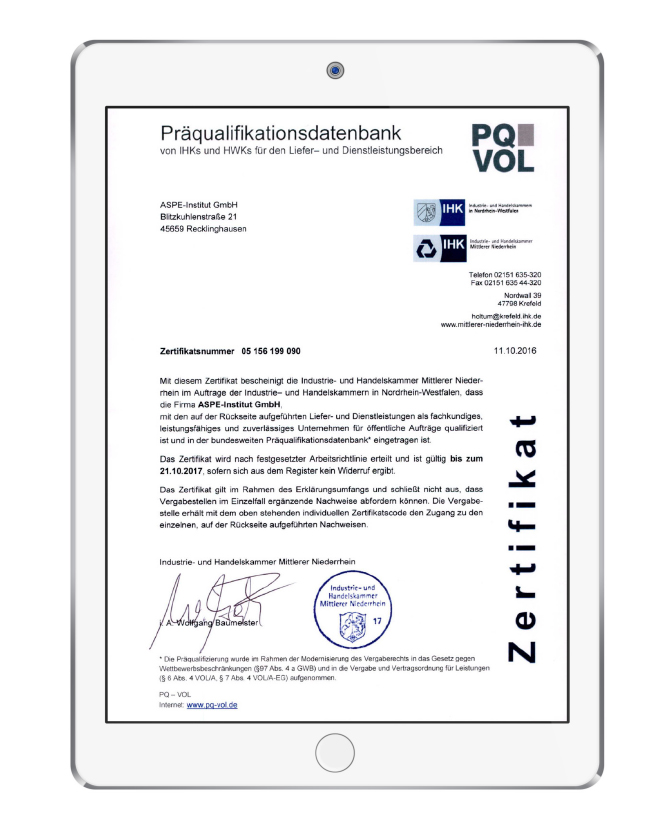 Seit Oktober 2016 ist unser Unternehmen in der Präqualifzierungsdatenbank zertifiziert, die von der IHK Krefeld für das Bundesgebiet verwaltet wird.